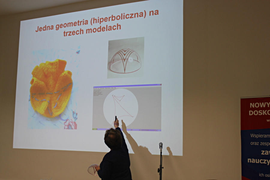 W drugiej części warsztatów uczestnicy poznali powierzchnie będące modelami trzeciego systemu geometrycznego - geometrii hiperbolicznej. Na koniec Prof. Istvan Lenart zrobił niezwykle atrakcyjny pokaz geometrii rzutowej, którym zachwycił uczestników projektu.
