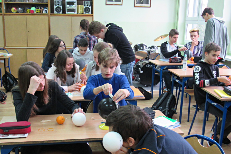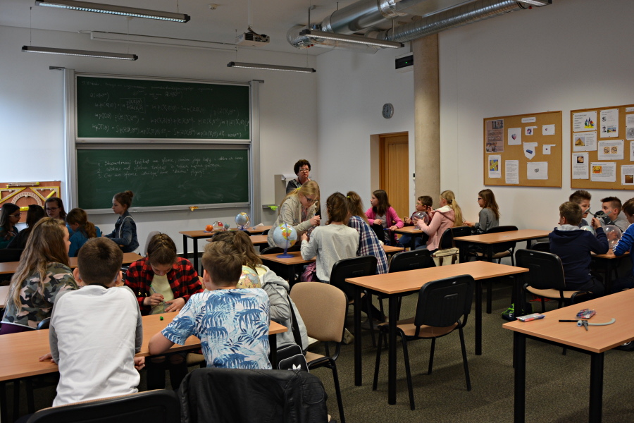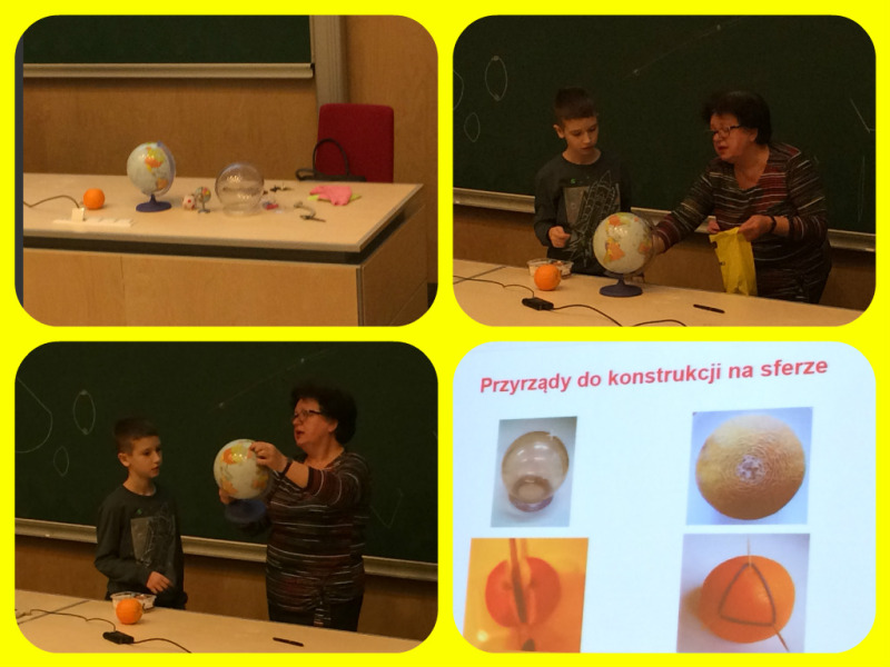 11 kwietnia 2018 roku odwiedzili nas uczniowie klas piątych Szkoły Podstawowej nr 16 w Białymstoku i uczestniczyli w warsztatach z geometrii sferycznej. Odkrywali własności figur geometrycznych na powierzchni kuli. Posługiwali się globusami, owocami i modelami kuli, na których wykonywali konstrukcje geometryczne i pomiary.