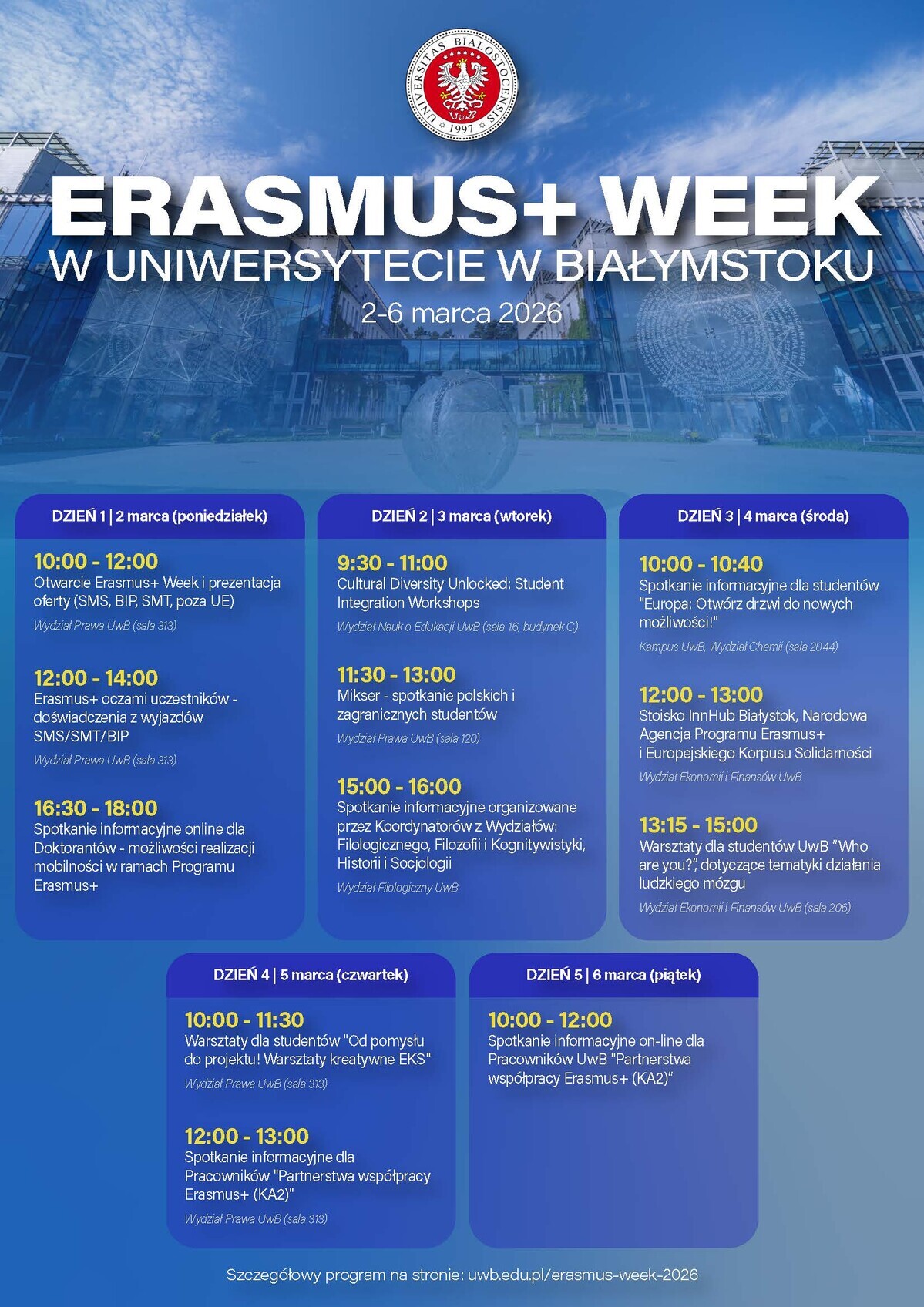 - Wydział Prawa UwB (sala 313), godz. 10:00 - 12:00: Otwarcie Erasmus+ Week i prezentacja oferty programu Erasmus+ w zakresie mobilności studentów.