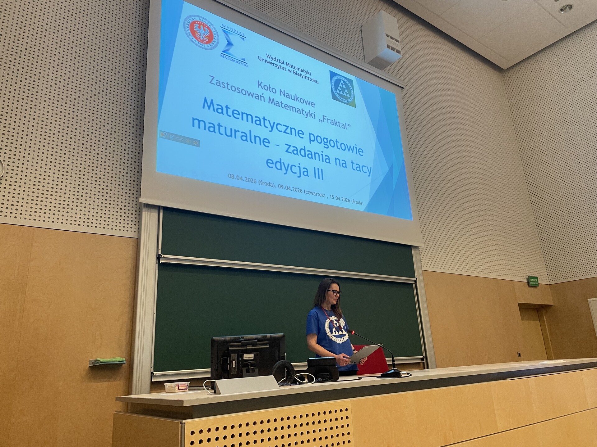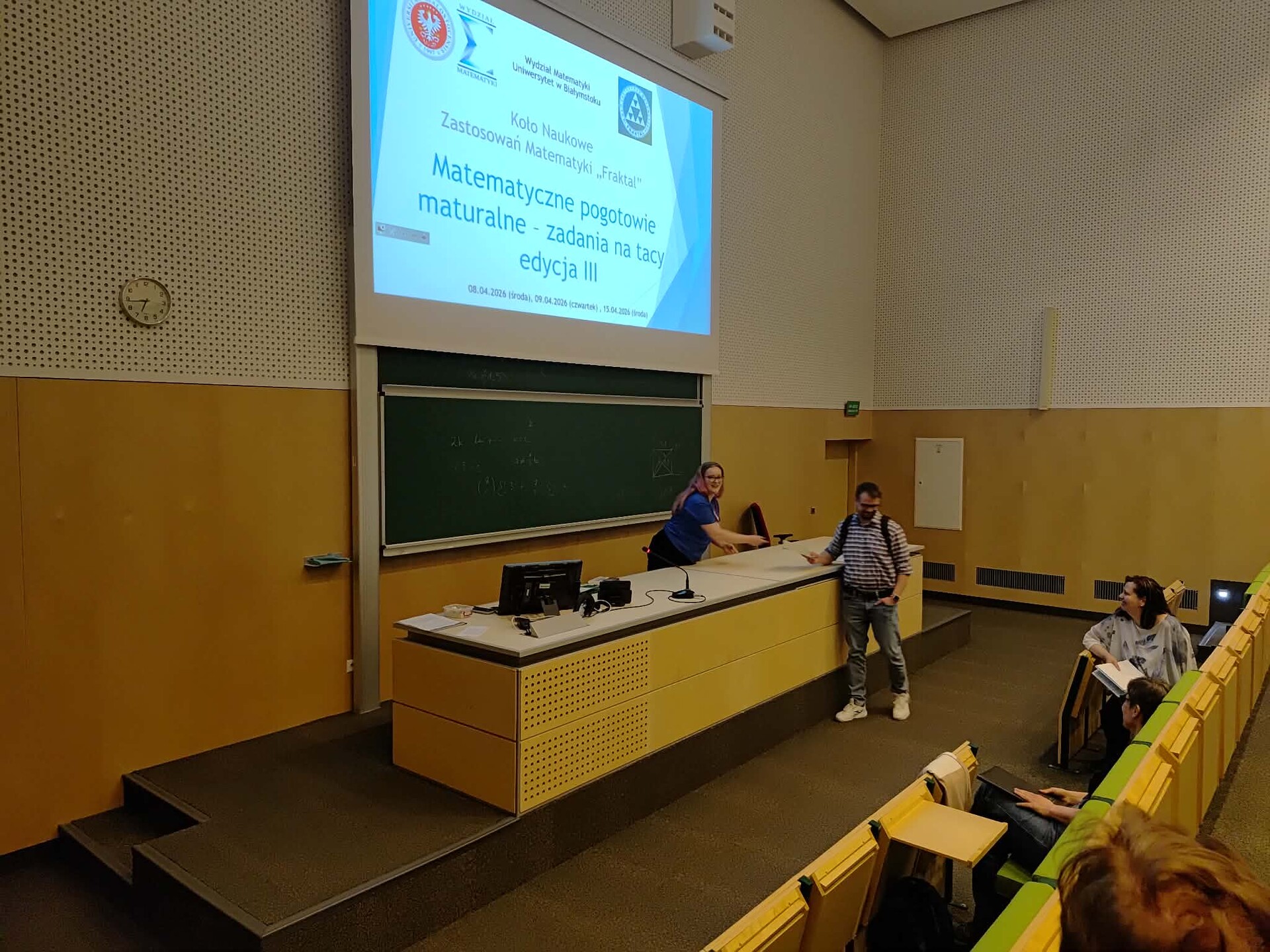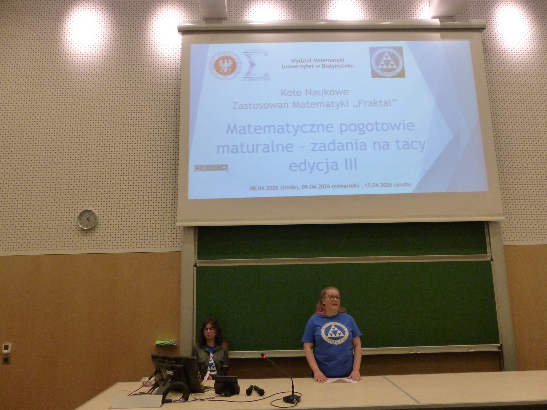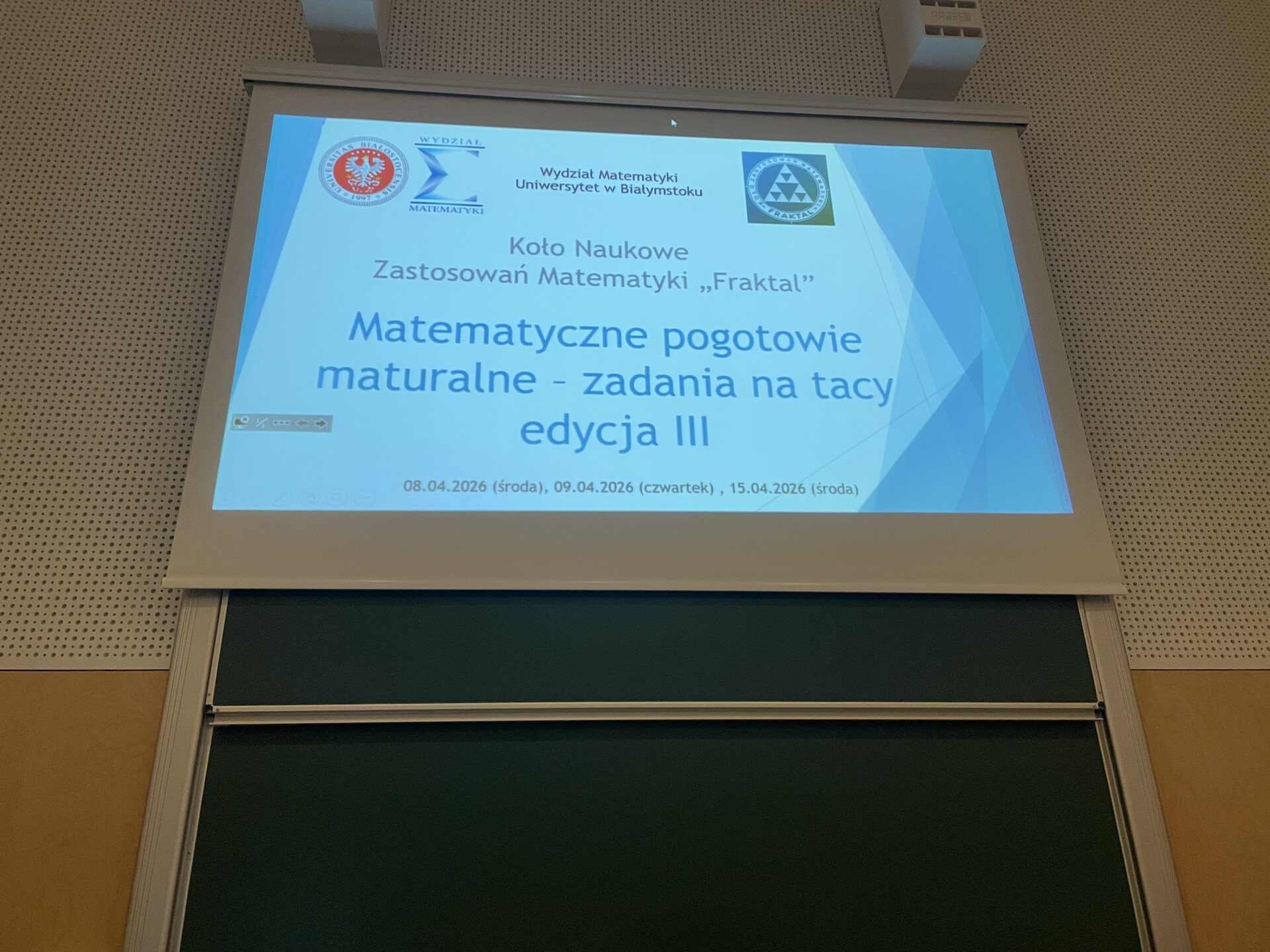 Koło Naukowe Zastosowań Matematyki Fraktal, działające przy Wydziale Matematyki Uniwersytetu w Białymstoku, po raz trzeci zrealizowało projekt „Matematyczne Pogotowie Maturalne – Zadania na tacy” – cykl bezpłatnych spotkań przygotowujących uczniów szkół średnich do matury z matematyki.