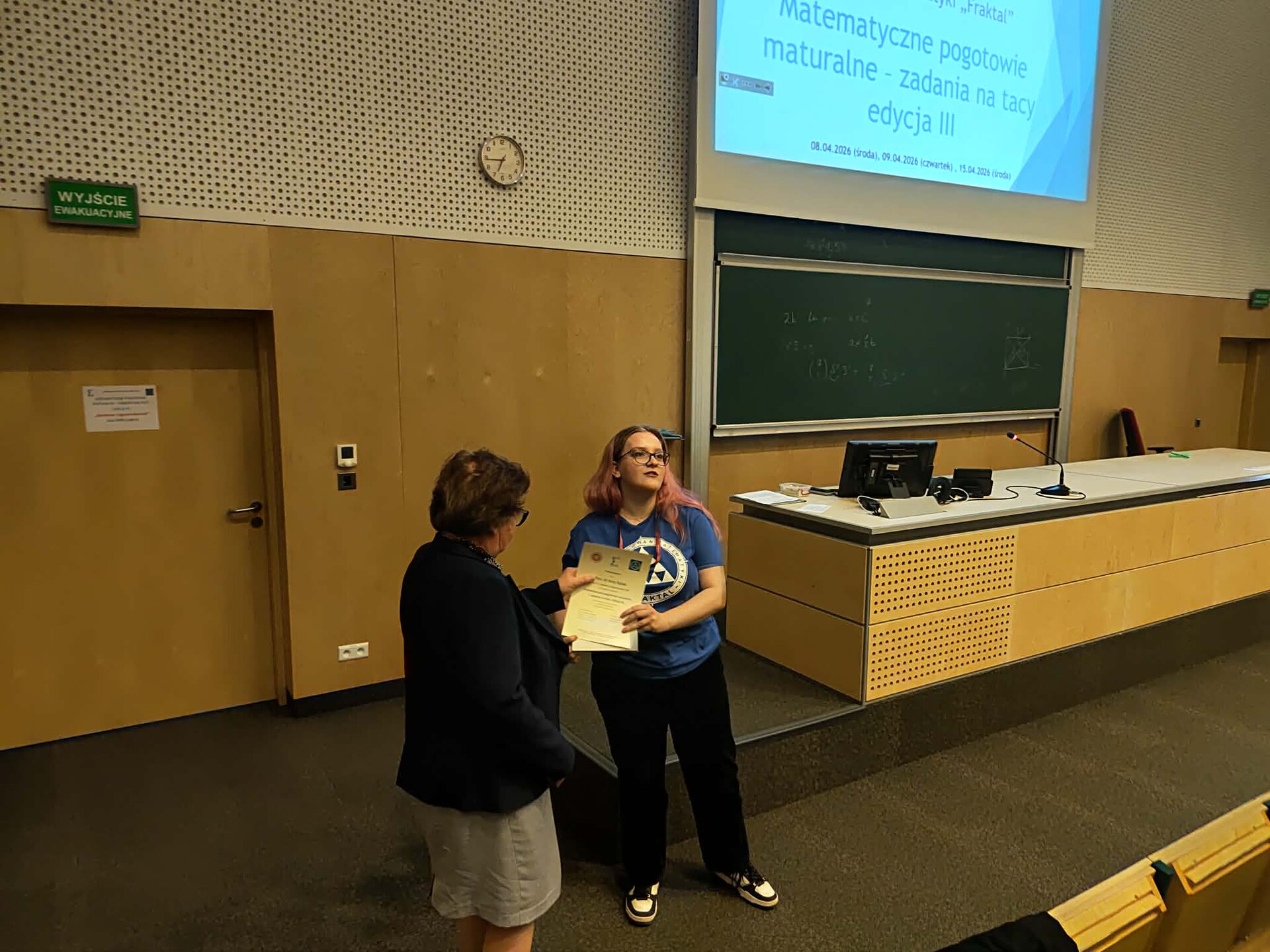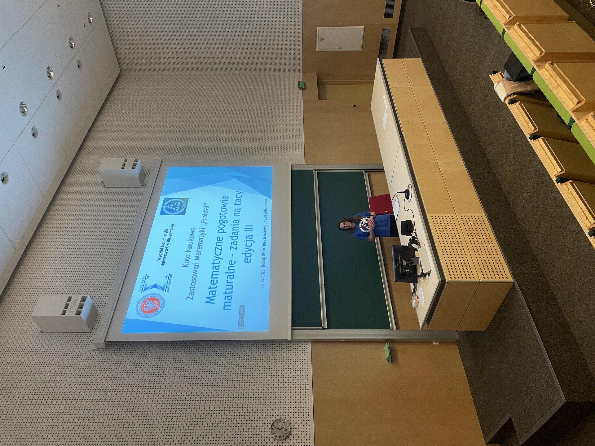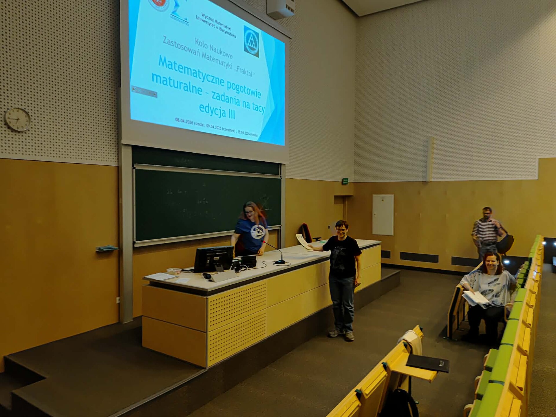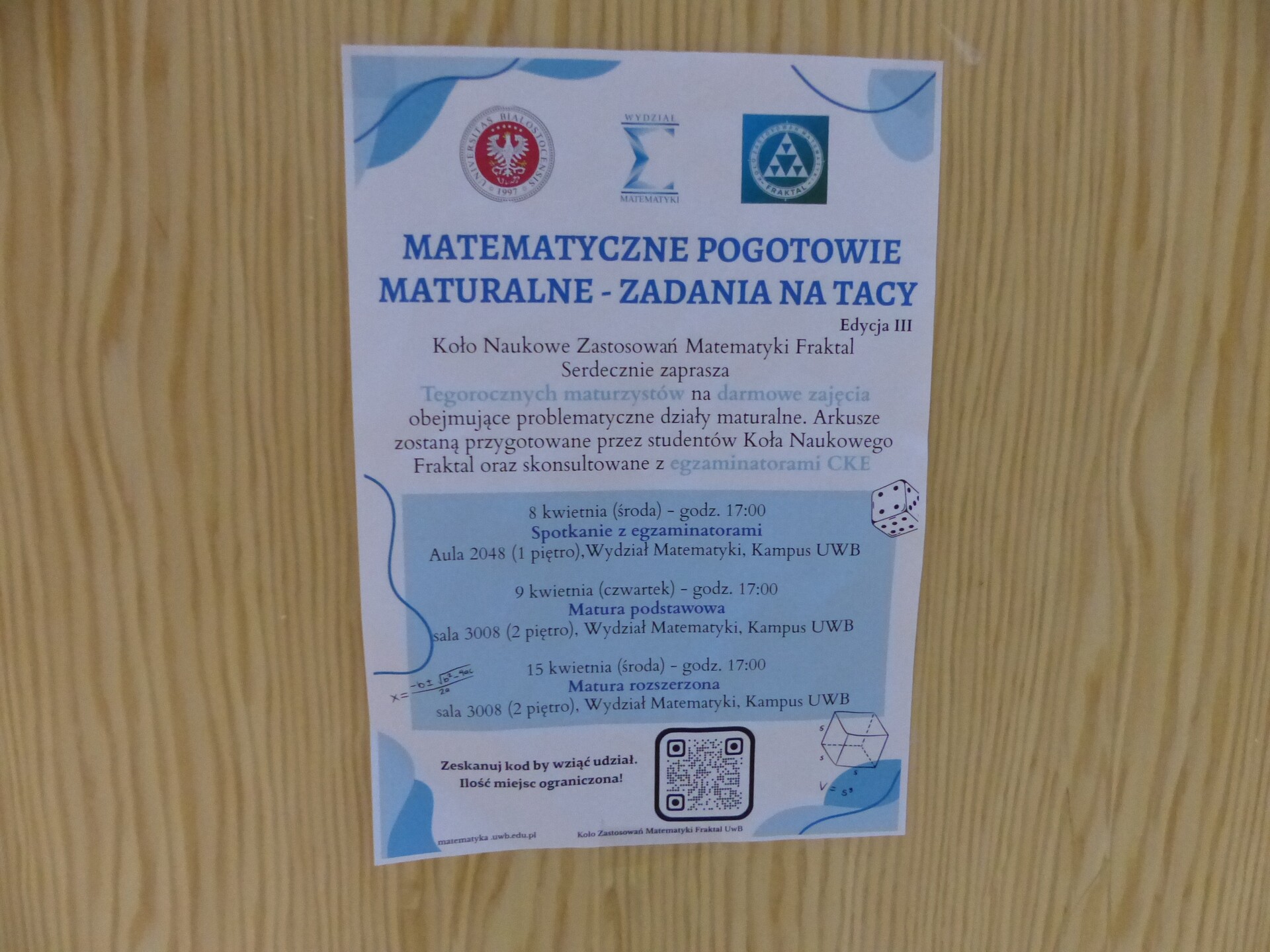 Koło Naukowe Zastosowań Matematyki Fraktal, działające przy Wydziale Matematyki Uniwersytetu w Białymstoku, po raz trzeci zrealizowało projekt „Matematyczne Pogotowie Maturalne – Zadania na tacy” – cykl bezpłatnych spotkań przygotowujących uczniów szkół średnich do matury z matematyki.