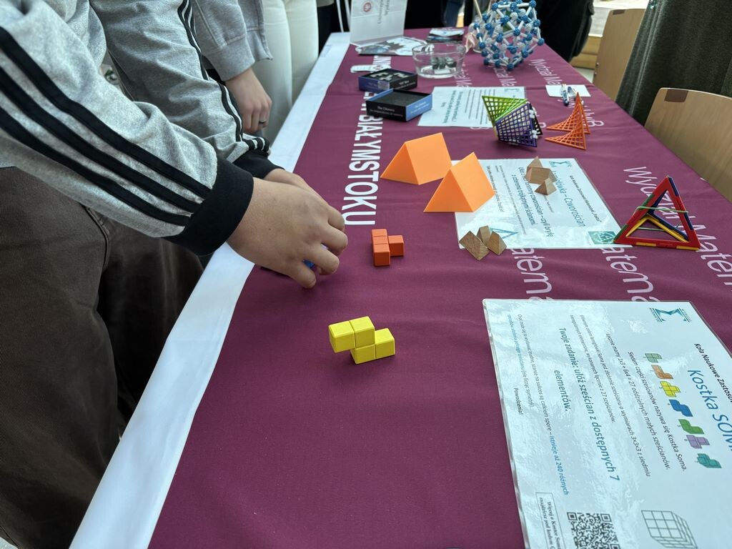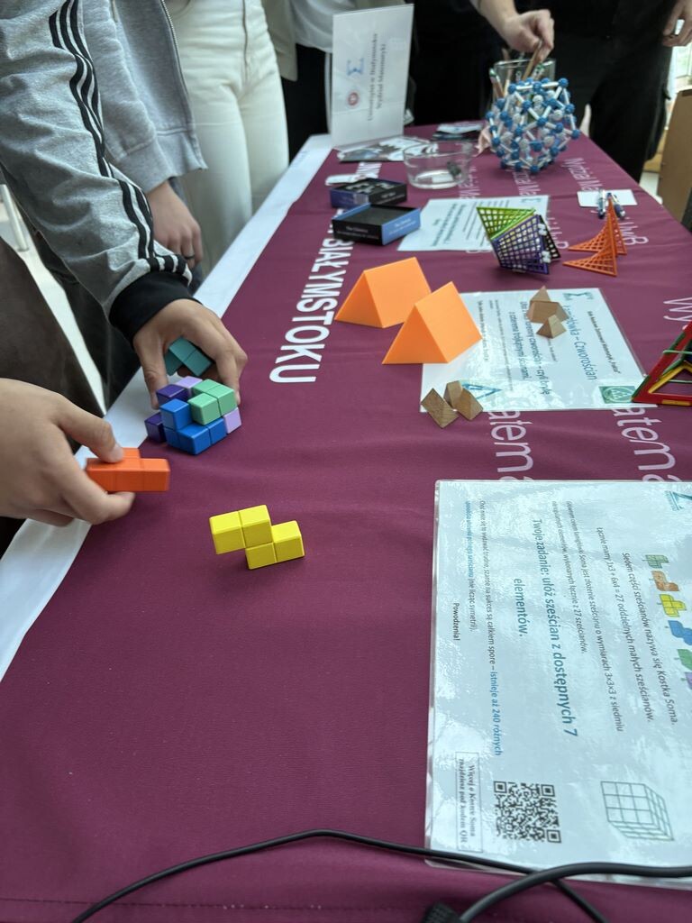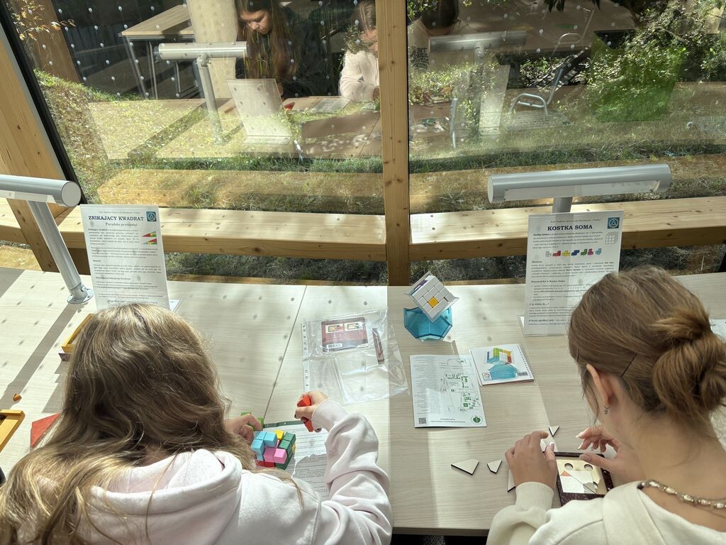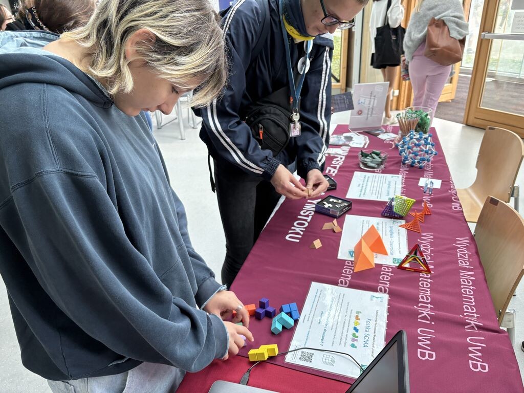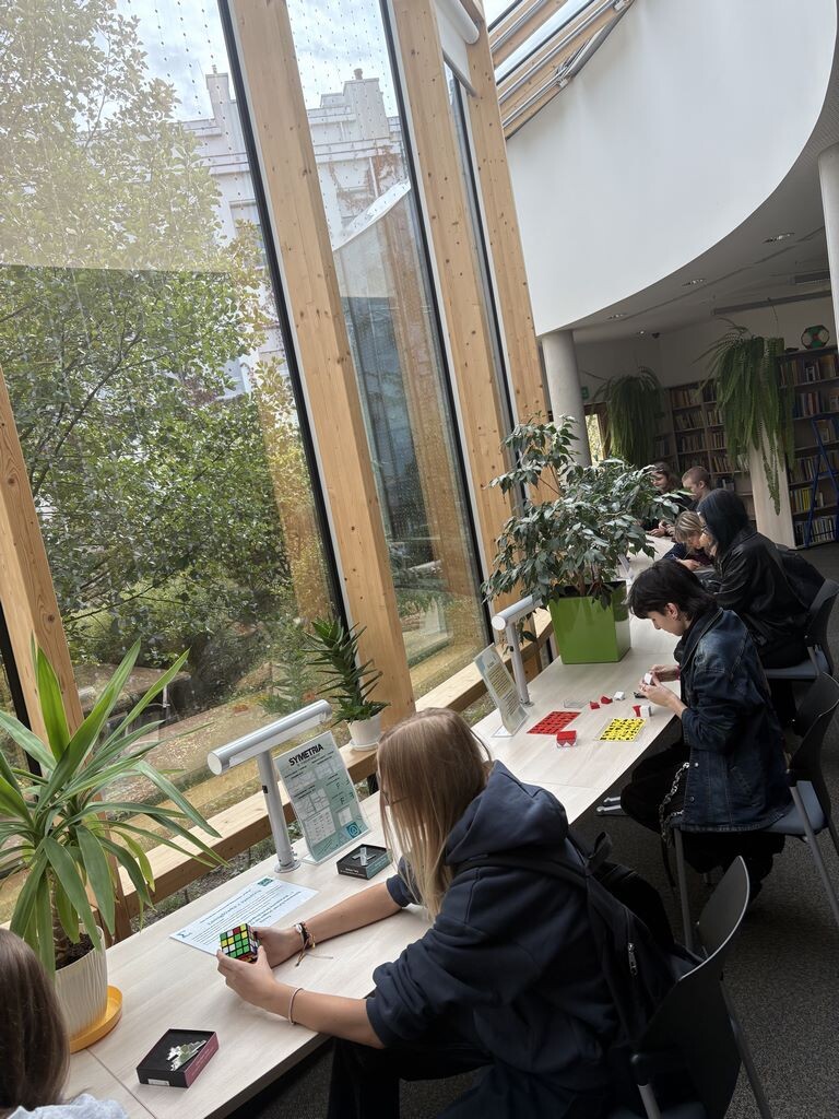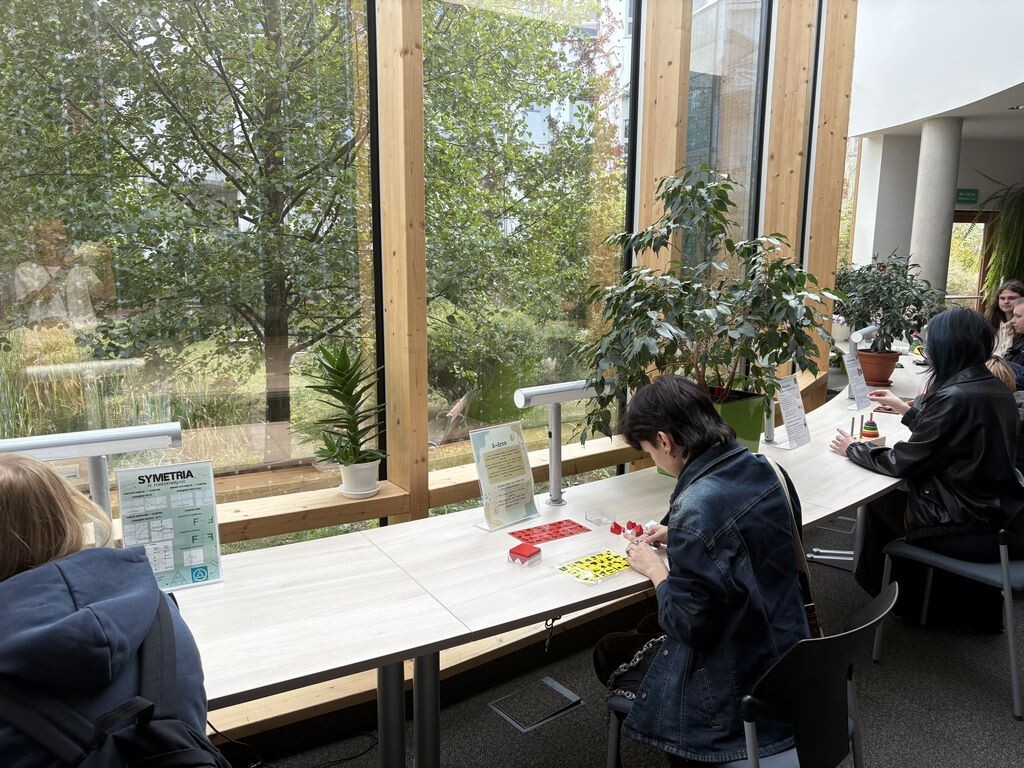 Maturzyści chętnie korzystali również ze Strefy Łamigłówek i Strefy Gier dostępnych w Bibliotece Matematycznej, które zostały stworzone przez Koło Naukowe Fraktal w ramach projektu „Z Fraktalem wśród łamigłówek” z programu Młodzieżowe Podlaskie Lokalnie w semestrze letnim roku akademickiego 2024/2025.
