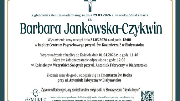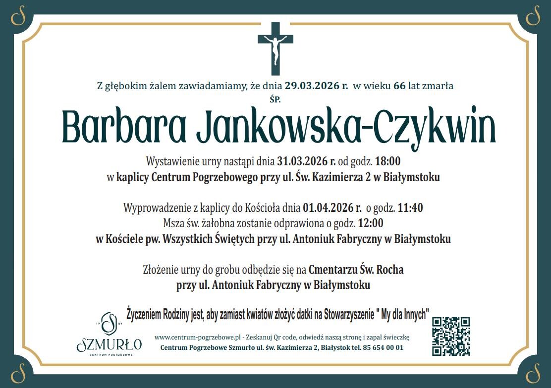 Z głębokim żalem przyjęliśmy wiadomość o śmierci Pani Barbary Jankowskiej-Czykwin, wieloletniego pracownika Dziekanatu Wydziału Matematyki Uniwersytetu w Białymstoku.