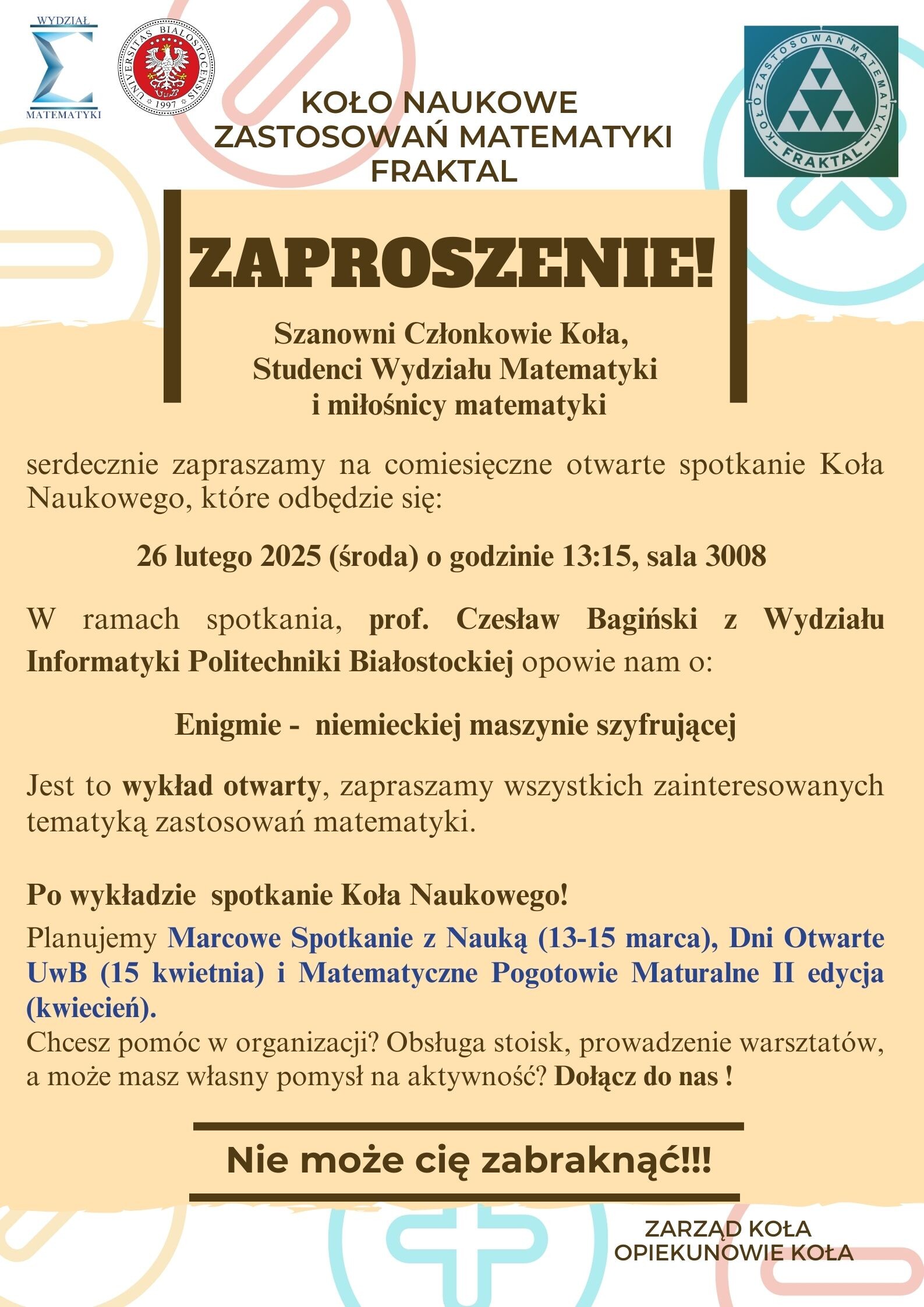 W środę 28 maja 2025 roku odbył się ostatni w tym roku akademickim wykład z cyklu „Wykłady Otwarte Fraktala”, organizowanego przez Koło Naukowe Zastosowań Matematyki Fraktal.