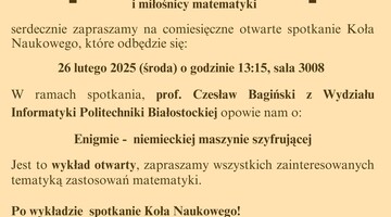 W roku akademickim 2024/2025 w ramach cyklu odbyło się sześć wykładów otwartych, organizowanych cyklicznie w ostatnie środy miesiąca. Każdy z nich poruszał tematykę związaną z zastosowaniami matematyki w różnych dziedzinach wiedzy i życia codziennego.