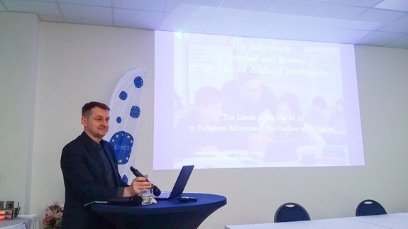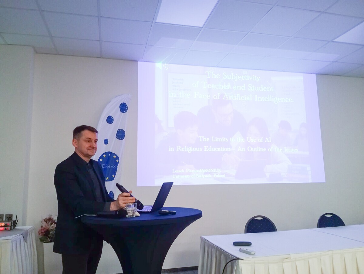 From 8 to 12 April 2026, Prague hosted the European Forum for Religious Education in Schools. The event was attended by Rev. Leszek Marius Jakoniuk, a staff member of the Chair of Catholic Theology at the University of Białystok, who delivered a plenary lecture in French entitled: “The Subjectivity of Teacher and Student in the Face of Artificial Intelligence. The Limits of the Use of AI in Religious Education – An Outline of the Issues”.