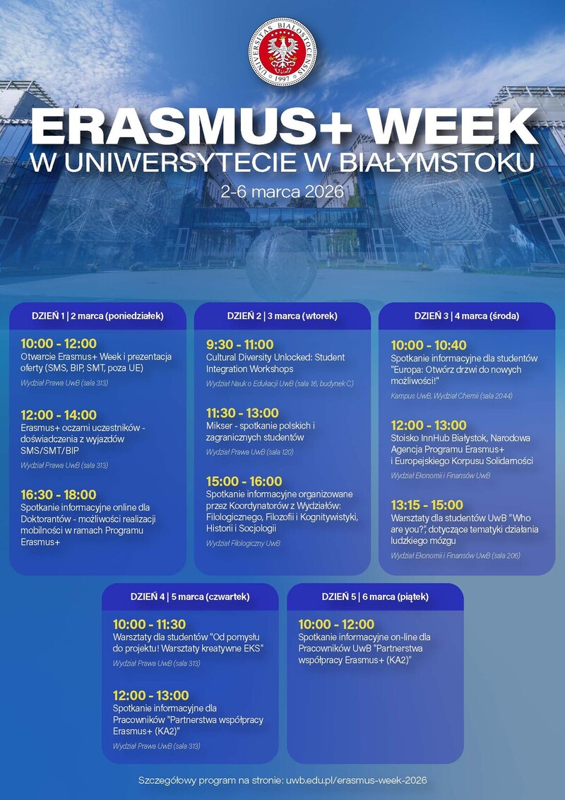To czas integracji i praktycznych informacji o zagranicznych wyjazdach. Dział Współpracy Międzynarodowej UwB zaprasza studentów, doktorantów i pracowników Uniwersytetu w Białymstoku do udziału w Erasmus+ Week 2026, który odbędzie się w dniach 2-6 marca 2026 r.