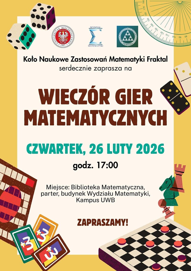 Koło Naukowe Zastosowań Matematyki Fraktal ma przyjemność serdecznie zaprosić całą społeczność akademicką na Wieczór Gier Matematycznych, który odbędzie się w czwartek, 26 lutego 2026 roku o godzinie 17:00 w Bibliotece Matematycznej.