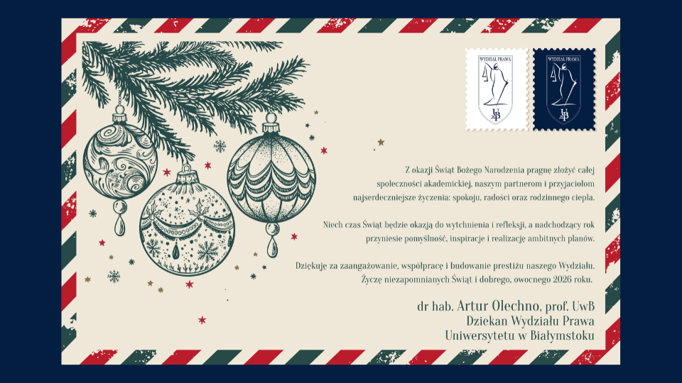 Życzenia świąteczne i noworoczne Dziekana Wydziału Prawa UwB - dr. hab. Artura Olechno, prof. UwB
