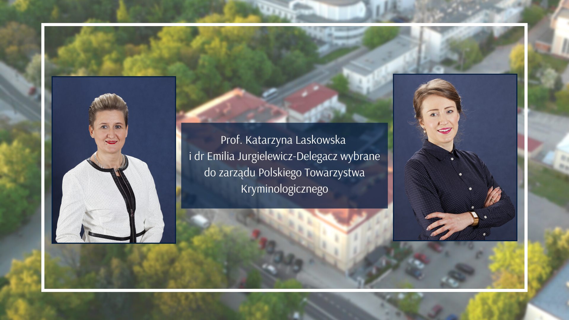 Grafika ze zdjęciem Wydziału Prawa, na jej tle dwa zdjęcia w ramce, przedstawiające kobiety na granatowym tle.