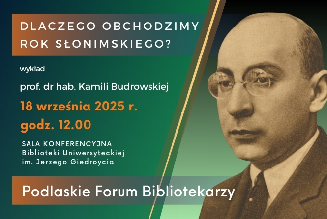 Grafika na stronę internetową przedstawiająca postać Antoniego Słonimskiego wraz z informacją o wykładzie z cyklu Podlaskiego Forum Bibliotekarzy